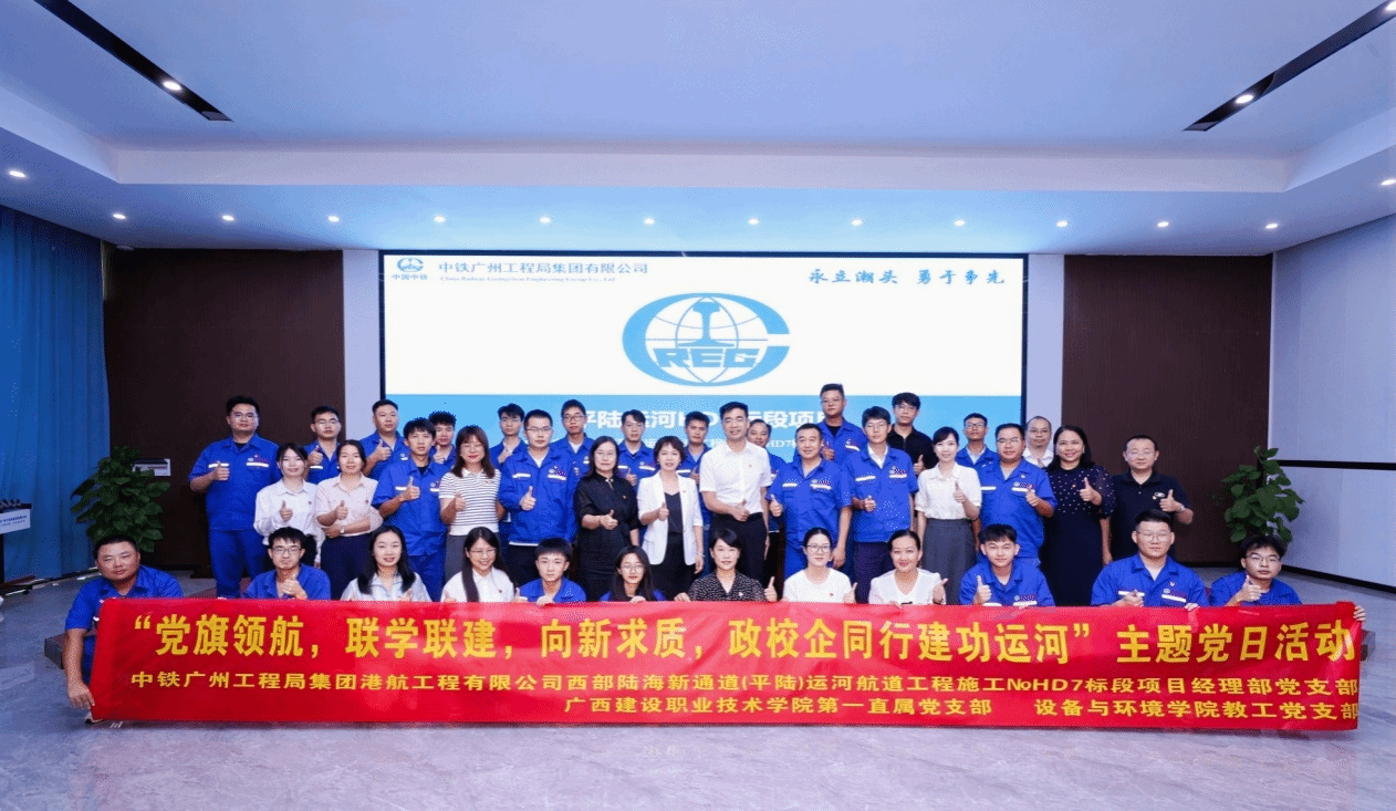 广西建院9月15日讯(继续教育学院 甘思源)近日,开云线上平台_开云(中国)与中铁广州工程局集团港航工程有限公司在西部陆海新通道(平陆)运河航道工程施工№HD7标段项目经理部签署党建共建协议,跨上党建共建、资源共享、共同发展新台阶。签订仪式后举办了以“党旗领航,联学联建,向新求质,政校企同行建功运河”为主题的党日活动,学校柏挺副校长,第一直属支部委员会、设备与环境学院教工支部委员会、土木工程学院教工第二支部委员会的党员代表参加活动。