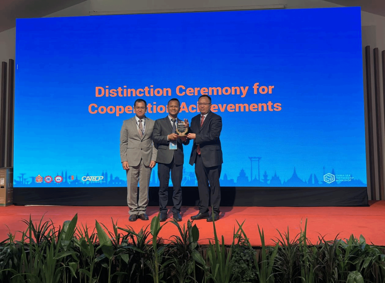 柬埔寨教育、青年和体育部国务秘书科尔冯·瓦德那(中)、东南亚教育部长组织技术教育发展区域中心主任宋亨·艾博士(左)为开云线上平台_开云(中国)代表付春松副校长(右)授奖