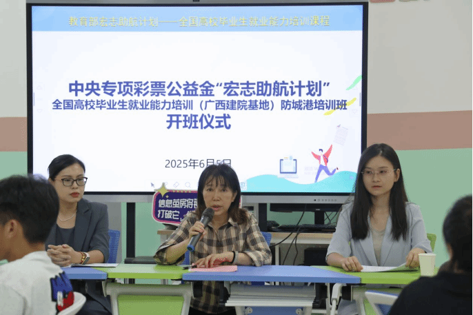 6月5日,教育部“宏志助航计划”全国高校毕业生就业能力培训开云线上平台_开云(中国)基地2025年第1期培训班在防城港职业技术学院正式开班。防城港职业技术学院招生就业处处长罗蔓,广西建院基地练翠滢老师、授课教师巫妮燕,以及来自防城港职业技术学院的30余名2026届应届毕业生参加开班仪式。