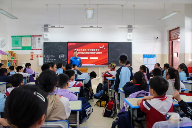 英烈精神铸魂,红色故事激荡人心。活动在庄严而深情的理论宣讲中拉开帷幕。宣讲团成员围绕不同主题,将宏大历史化为鲜活故事,娓娓道来。骆靖坤以“湘江铸魂,英烈流芳”为题,讲述了湘江战役中陈树湘“断肠明志”、韩伟浴血坚守、杜中美无畏冲锋的壮烈事迹;赵子丞带来《最后的党费》的动人回溯,重现了林景云烈士负伤前焚毁文件、留下光洋作党费的感人细节;覃热则以“从龙州起义到新时代护边精神”为主线,串联起革命岁月与当代守边故事。宣讲以真情实感打动人心,引导孩子们铭记历史、崇尚奉献。