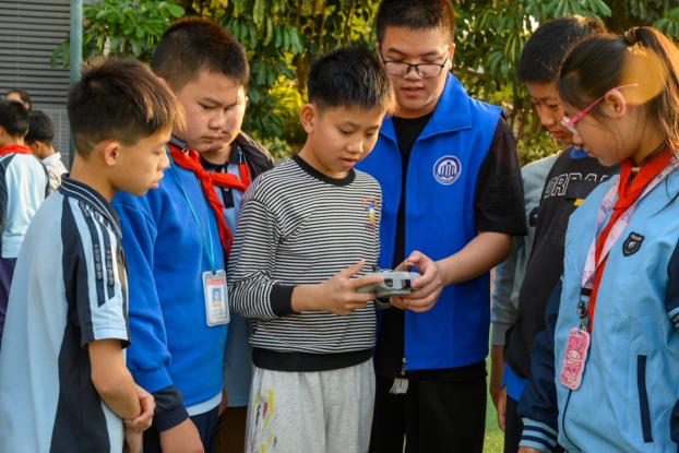 志愿者带领小学生操作无人机