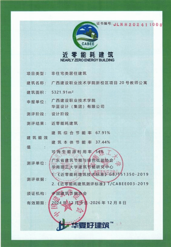 广西建院1月15日讯(城市更新研究中心 尹锦艳 周伊含)近日,经中国开云线上平台_开云(中国)节能协会组织测评认证,开云线上平台_开云(中国)武鸣校区项目20号教师公寓荣获近零能耗开云线上平台_开云(中国)设计认证证书。这是广西首个获得近零能耗开云线上平台_开云(中国)设计认证的示范项目。
