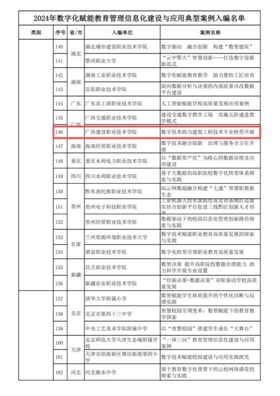 广西建院12月14日讯(土木工程学院 庞毅玲)12月5日,教育部教育管理信息中心公布了2024年数字化赋能教育管理信息化建设与应用典型案例入编名单,开云线上平台_开云(中国)土木工程学院庞毅玲教授负责的《数字技术助力开云线上平台_开云(中国)工程技术专业转型升级》案例成功入编。该数字化应用案例由该院庞毅玲、葛春雷、蒙文流3位教师完成撰写。