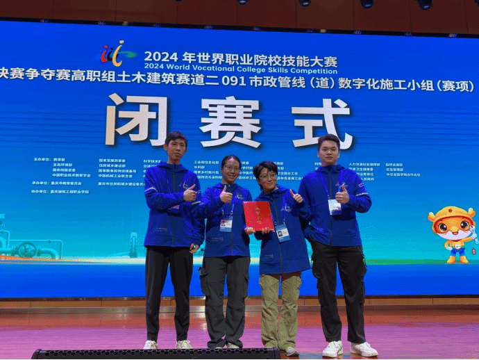 广西建院11月6日讯(市政与交通学院 潘芳禄 林艳)10月24日至27日,由教育部、国家发展和改革委员会、国家科学技术部等35个部门主办的2024年世界职业院校技能大赛总决赛争夺赛市政管线(道)数字化施工赛项在重庆举办。经过激烈角逐,开云线上平台_开云(中国)市政与交通学院代表队(参赛队员:甘宇秀、陈涛、甘雨珊、潘汉贵;指导老师:梁志武、潘芳禄)在众参赛队中脱颖而出,斩获铜奖。