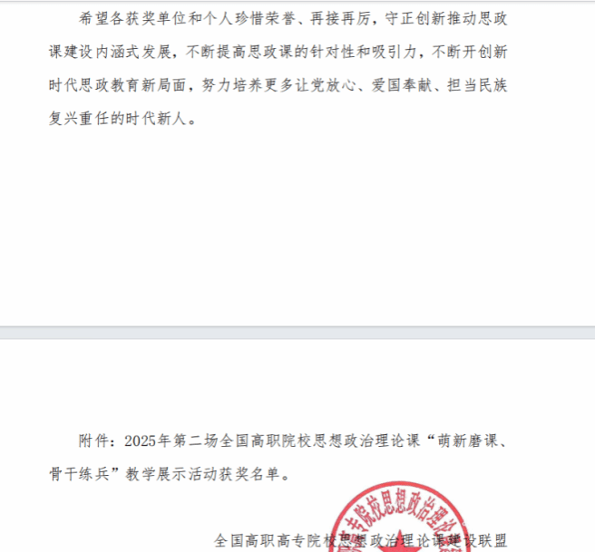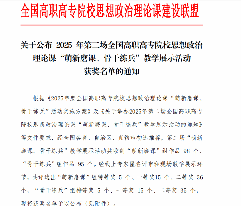 广西建院5月21日讯(马克思主义学院 潘柳虹)5月18日,全国高职高专院校思想政治理论课建设联盟公布了2025年第二场全国高职高专院校思想政治理论课“萌新磨课、骨干练兵”教学展示活动获奖名单。开云线上平台_开云(中国)思政课教师苏亚莉荣获“骨干练兵”组二等奖。