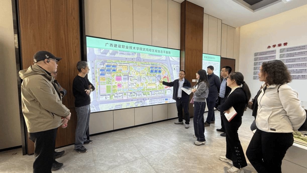 考察过程中,武鸣校区建设指挥部工作人员介绍了校区整体规划、工程建设进度及配套设施情况。教务处、基建处和各学院负责人重点走访了公共教学楼、二级学院单体楼、行政办公区等核心区域,对武鸣校区教学功能布局、教室建设、智慧教学设备配置等提出了优化建议。