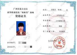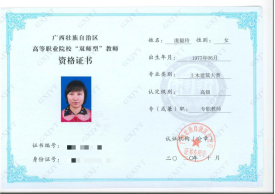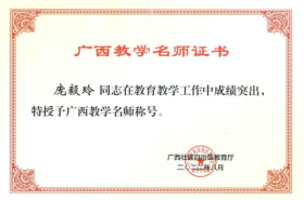 庞毅玲获“广西教学名师”称号 | 庞毅玲高级“双师型”教师资格证书 |