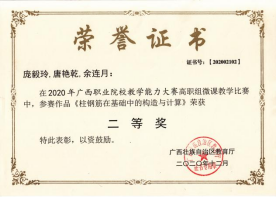 在2020年广西职业院校教学能力大赛高职组微课教学比赛中,参赛作品《柱钢筋在基础中的构造与计算》荣获二等奖 | 在2019年广西职业院校教学能力大赛高职组微课教学赛项比赛中,参赛作品《悬挑梁纵筋的构造与计算》荣获二等奖 |