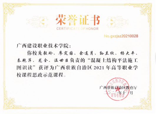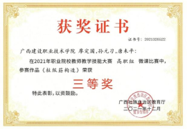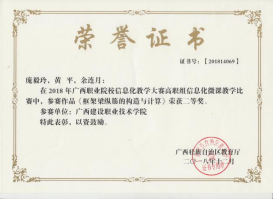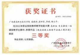 在2018年广西职业院校信息化教学大赛高职组信息化微课教学比赛中,参赛作品《框架梁纵筋的构造与计算》荣获二等奖 | 在2022年全区职业院校教师教学技能大赛微课教学比赛中,参赛作品《楼梯识图与钢筋计算》荣获三等奖 |