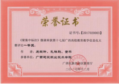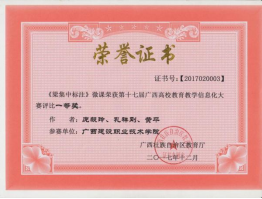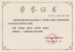 2017年《梁集中标注》微课荣获第十七届广西高校教育教学信息化大赛评比一等奖 | 2016年《梁的钢筋》微课获第十六届广西高校教育教学软件应用大赛评比一等奖 |