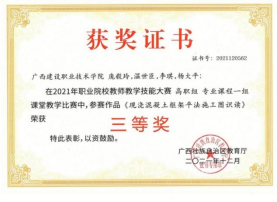 在2021年职业院校教师教学技能大赛高职组专业课程一组课堂教学比赛中,参赛作品《现浇混凝土框架平法施工图识读》荣获三等奖 |