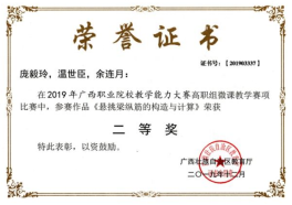 《悬挑梁纵筋的构造与计算》微课教学比赛荣获2019广西职业院校教学能力大赛高职组微课教学比赛二等奖 | 《框架梁纵筋的构造与计算》微课教学比赛荣获2018广西职业院校信息化教学大赛高职组二等奖 |