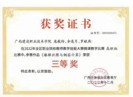 在2018年广西职业院校信息化教学大赛高职组信息化微课教学比赛中,参赛作品《框架梁纵筋的构造与计算》荣获二等奖 | 在2022年全区职业院校教师教学技能大赛微课教学比赛高职组比赛中,参赛作品《楼梯识图与钢筋计算》荣获三等奖 |