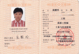 庞毅玲教授职称证书 | 庞毅玲高级工程师职称证书 |