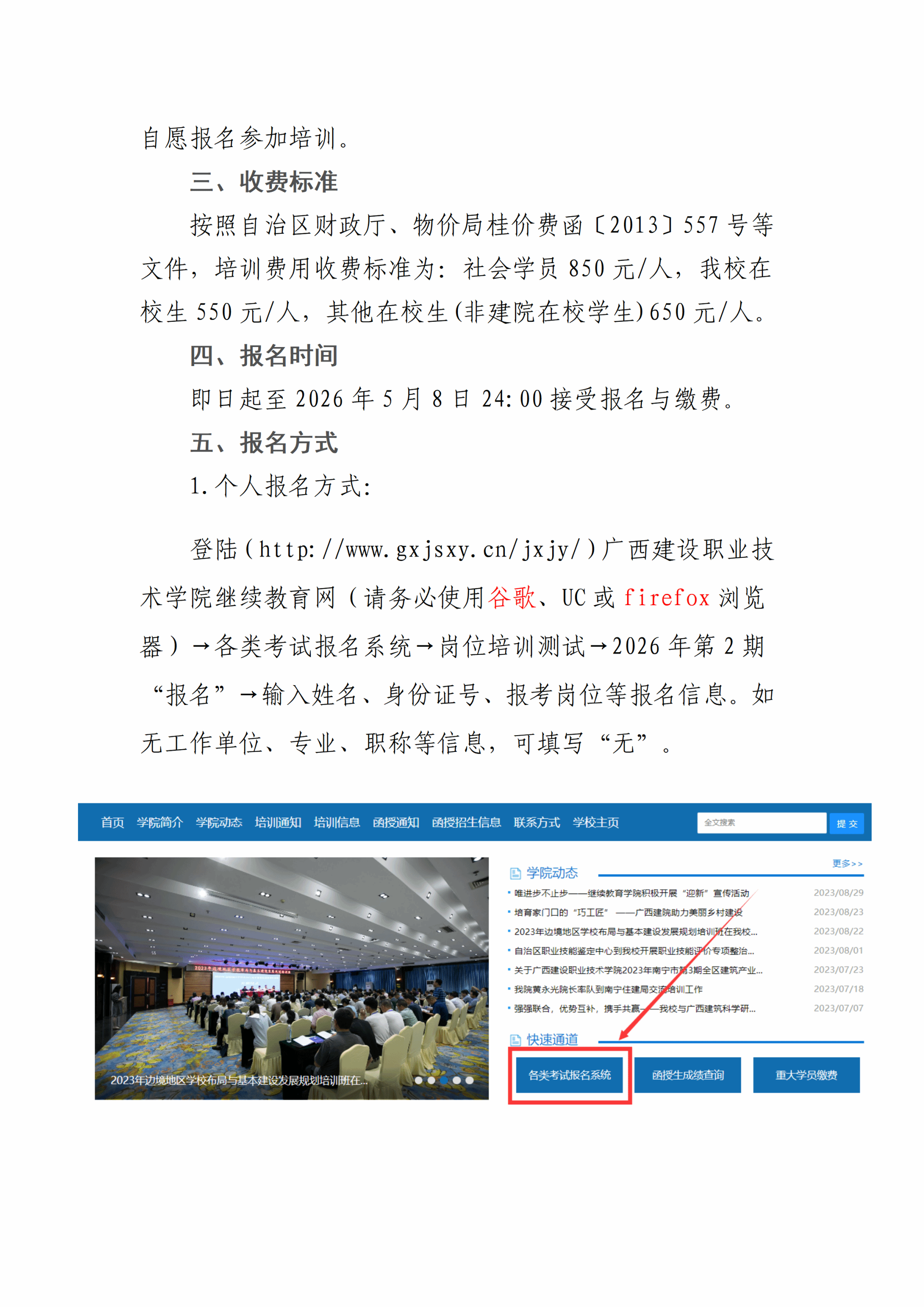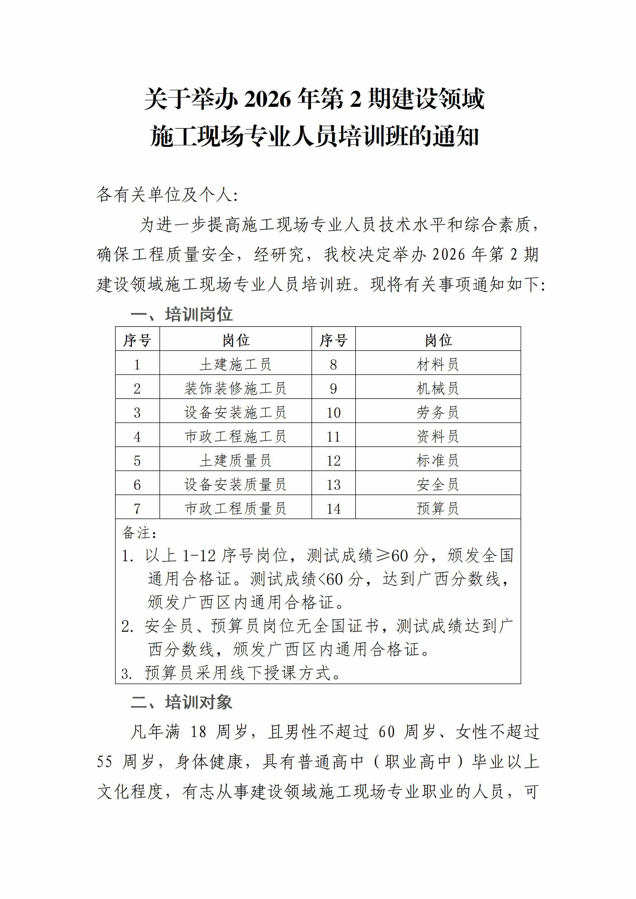 培训通知 当前位置: 首页 >> 培训通知 >> 正文 关于举办2026年第2期建设领域施工现场专业人员培训班的报名通知 发布日期:2026-03-13 点击: 附件【关于举办2026年第2期建设领域施工现场专业人员培训班的报名通知 (1).docx】已下载次