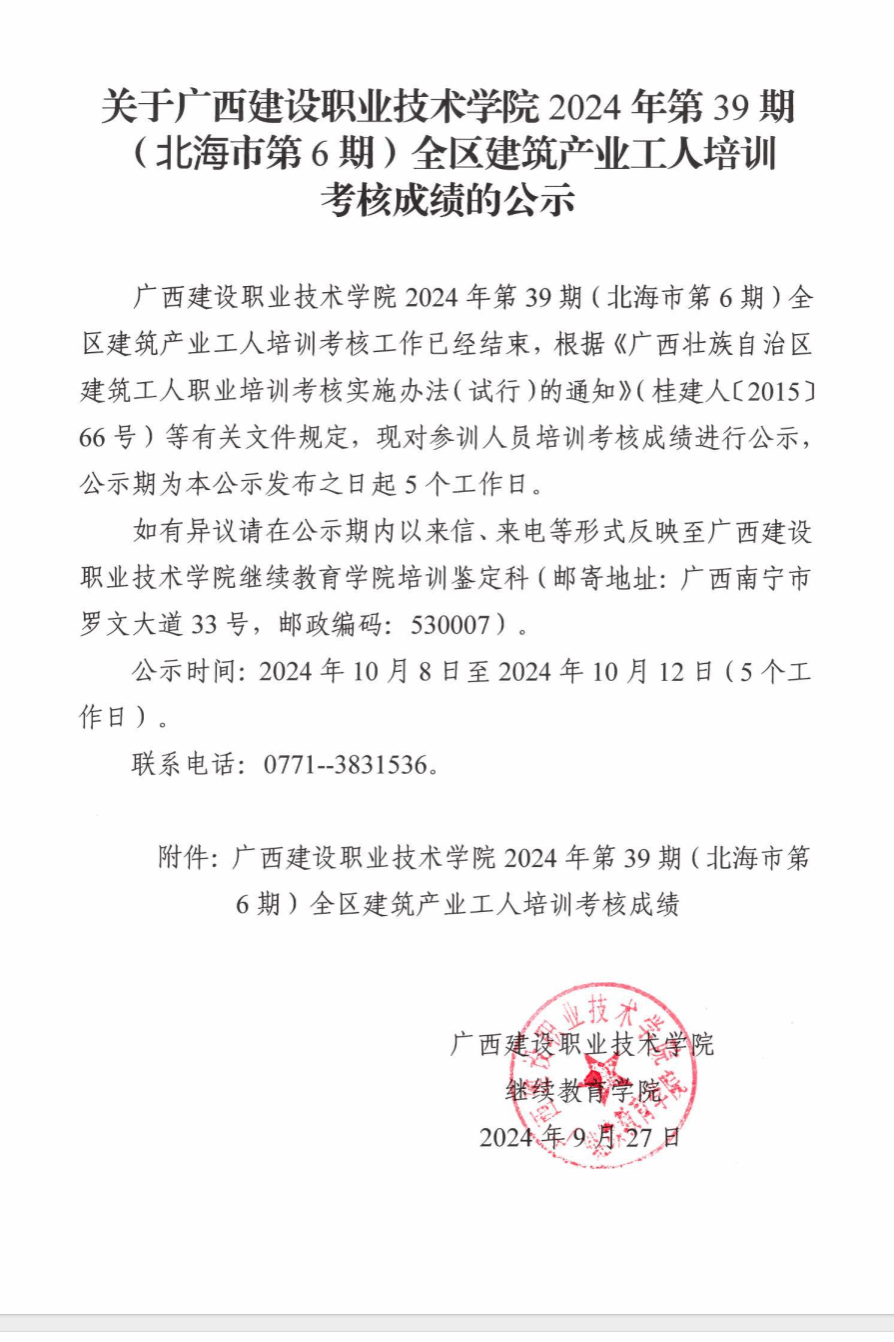 培训信息 当前位置: 首页 >> 培训信息 >> 正文 关于开云线上平台_开云(中国)2024年第39期(北海市第6期)全区开云线上平台_开云(中国)产业工人培训考核成绩的公示 发布日期:2024-09-30 点击: 附件【关于开云线上平台_开云(中国)2024年第39期(北海市第6期)全区开云线上平台_开云(中国)产业工人培训考核成绩的公示.pdf】已下载次