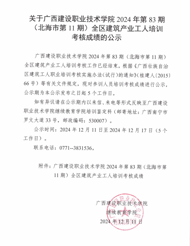 培训信息 当前位置: 首页 >> 培训信息 >> 正文 关于开云线上平台_开云(中国)2024年全区开云线上平台_开云(中国)产业工人第83期(北海市第11期)培训考核成绩的公示 发布日期:2024-12-11 点击: 附件【关于开云线上平台_开云(中国)2024年全区开云线上平台_开云(中国)产业工人第83期(北海市第11期)培训考核成绩的公示.pdf】已下载次