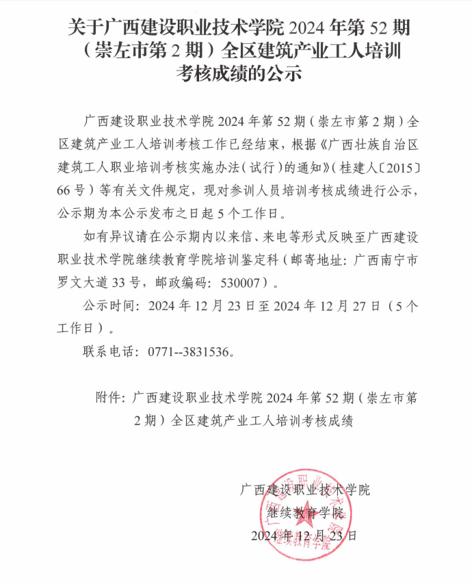 培训信息 当前位置: 首页 >> 培训信息 >> 正文 关于开云线上平台_开云(中国)2024年全区开云线上平台_开云(中国)产业工人第52期(崇左市第2期)培训考核成绩的公示 发布日期:2024-12-23 点击: 附件【关于开云线上平台_开云(中国)2024年全区开云线上平台_开云(中国)产业工人第52期(崇左市第2期)培训考核成绩的公示.pdf】已下载次