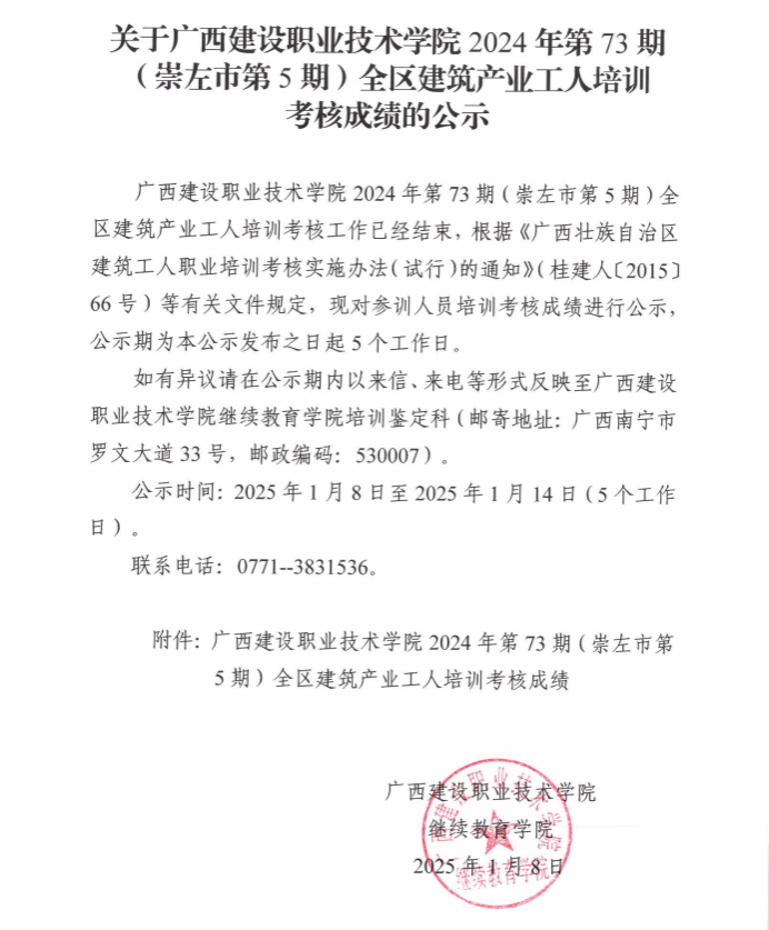 培训信息 当前位置: 首页 >> 培训信息 >> 正文 关于开云线上平台_开云(中国)2024年全区开云线上平台_开云(中国)产业工人第73期(崇左市第5期)培训考核成绩的公示 发布日期:2025-01-09 点击: 附件【关于开云线上平台_开云(中国)2024年全区开云线上平台_开云(中国)产业工人第73期(崇左市第5期)培训考核成绩的公示.pdf】已下载次