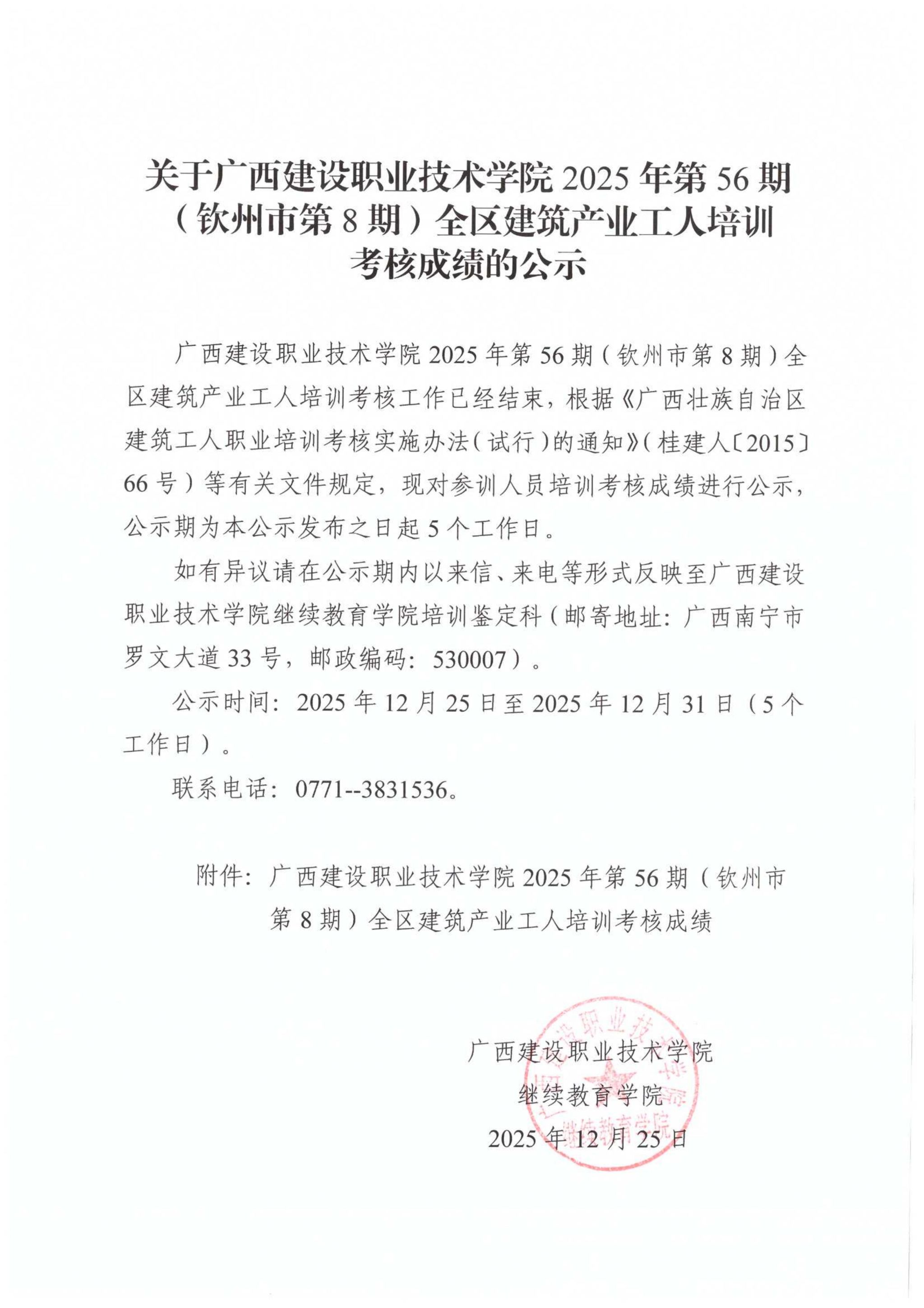 培训信息 当前位置: 首页 >> 培训信息 >> 正文 关于开云线上平台_开云(中国)2025年第56期(钦州市第8期)全区开云线上平台_开云(中国)产业工人培训考核成绩的公示 发布日期:2025-12-25 点击: 附件【关于开云线上平台_开云(中国)2025年第56期(钦州市第8期)全区开云线上平台_开云(中国)产业工人培训考核成绩的公示.pdf】已下载次