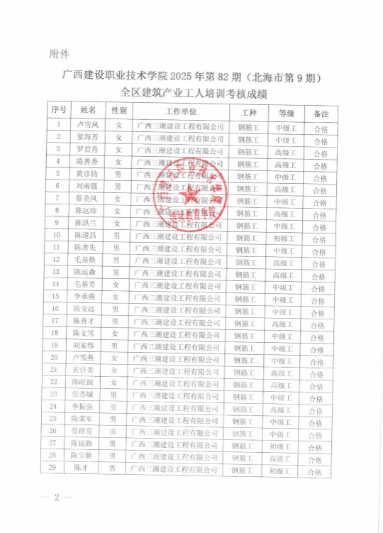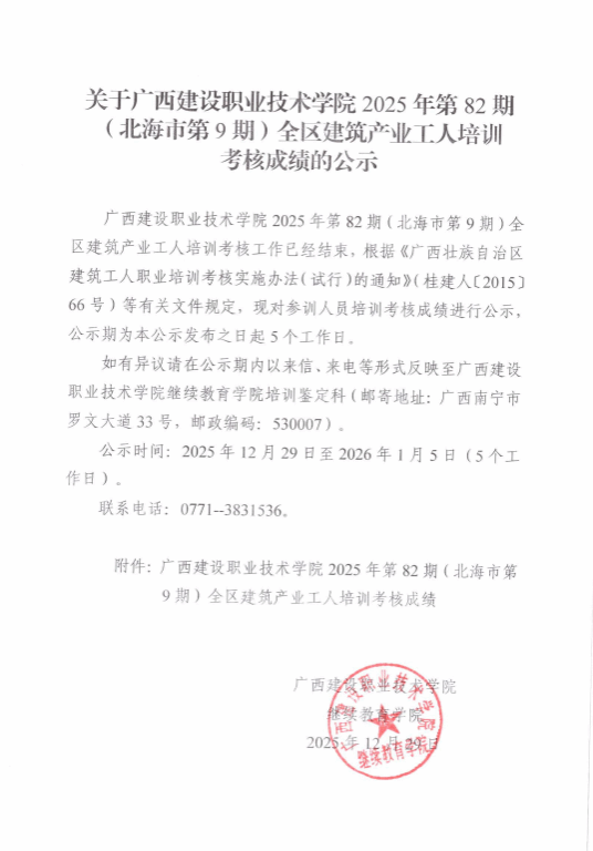 培训信息 当前位置: 首页 >> 培训信息 >> 正文 关于开云线上平台_开云(中国)2025年全区开云线上平台_开云(中国)产业工人第82期(北海市第9期)培训考核成绩的公示 发布日期:2025-12-29 点击: 附件【关于开云线上平台_开云(中国)2025年全区开云线上平台_开云(中国)产业工人第82期(北海市第9期)培训考核成绩的公示.pdf】已下载次