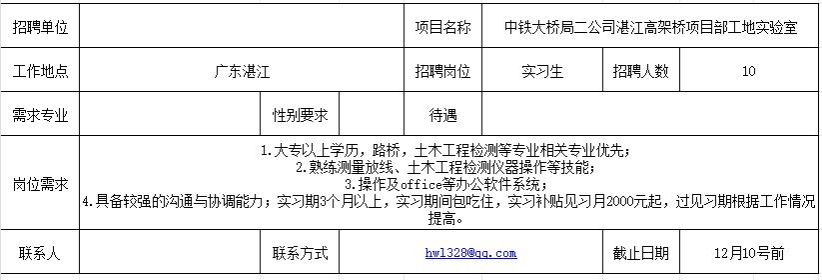 【招聘】中铁大桥局二公司湛江高架桥项目部工地实验室