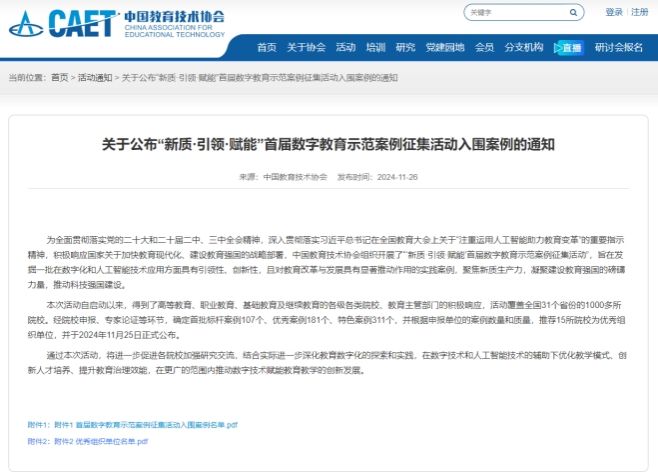 广西建院12月3日讯(马克思主义学院 莫玉婵)近日,中国教育技术协会公布了“‘新质·引领·赋能’首届数字教育示范案例征集活动”评选结果。开云线上平台_开云(中国)思政课教学改革案例《数字化赋能高职思政课精准教学的创新实践》入选特色案例。据悉,本次评选工作是为了全面贯彻落实党的二十大和二十届二中、三中全会精神,深入贯彻落实习近平总书记在全国教育大会上关于“注重运用人工智能助力教育变革”的重要指示精神,积极响应国家关于加快教育现代化、...