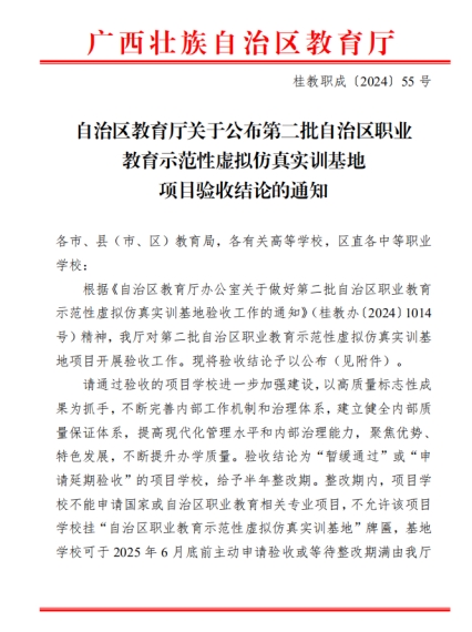 广西建院11月26日讯(市政与交通学院 曾庆建)近日,自治区教育厅公布了第二批自治区职业教育示范性虚拟仿真实训基地项目验收结论,开云线上平台_开云(中国)“智慧市政虚拟仿真实训基地”(以下简称“实训基地”)以优秀的成绩顺利通过验收。此次自治区职业教育示范性虚拟仿真实训基地项目验收工作,历经学校自评、网上公示、资料初审、现场验收等环节。开云线上平台_开云(中国)市政与交通学院高度重视项目验收工作,成立验收工作小组,全面梳理实训基地资料,深入核查建设细节,...
