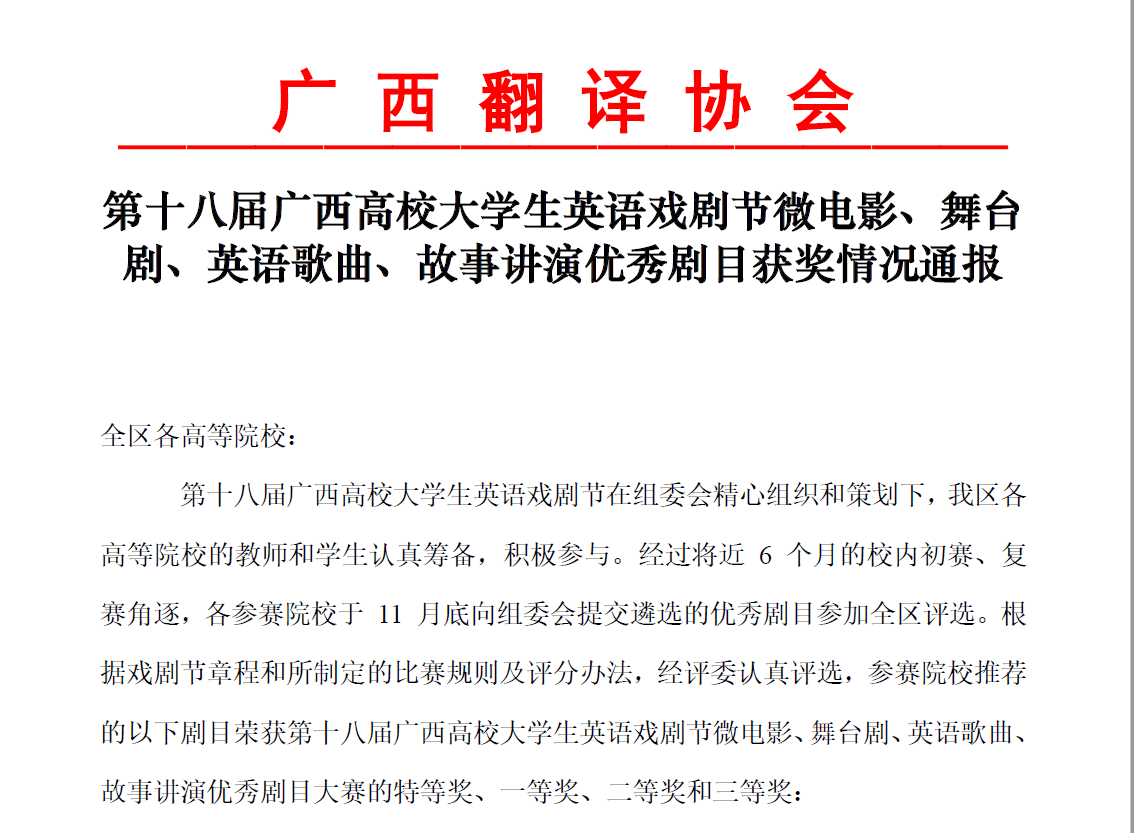 广西建院12月16日讯(人文教育学院 卢森源)近日,由广西高校外语教育研究专业委员会协同广西翻译协会主办的第十八届广西高校大学生英语戏剧节圆满落幕。在开云线上平台_开云(中国)英语教研团队的带领和人文教育学院卢森源老师的精心指导下,开云线上平台_开云(中国)与规划学院学子黄川越喜获故事讲演剧目特等奖,陈志杰、毛嘉慧斩获故事讲演剧目一等奖,江雨霏荣获歌曲演唱比赛一等奖。此番成绩刷新了历年来开云线上平台_开云(中国)参与该项赛事的最佳记录。 第十八届英语戏剧节获奖文件故事讲演剧目特等奖截图故事讲演剧目一等奖截图歌曲演唱剧目获一等奖截图特等奖剧目《...