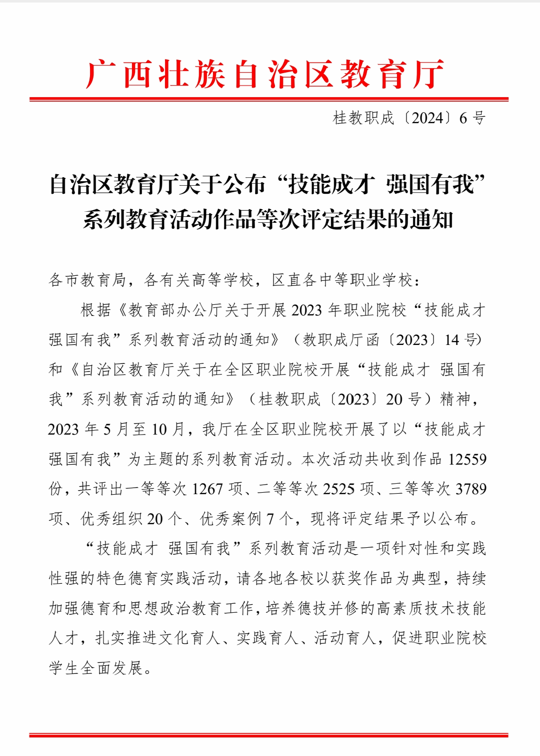 广西建院2月23日讯(党委学生工作部 田申)近日,根据《自治区教育厅关于公布“技能成才 强国有我”系列教育活动作品等次评定结果的通知》(桂教职成[2024]6号),开云线上平台_开云(中国)获奖12项,其中一等奖1项、二等奖6项、三等奖4项,典型案例荣获三等奖。文件通知开云线上平台_开云(中国)高度重视本次“技能成才 强国有我”系列教育活动。活动期间,开云线上平台_开云(中国)针对学生特点开展切合实际、生动有效、喜闻乐见的活动,坚持活动育人、实践育人、以文化人,实现“班班活动、人人参与”...