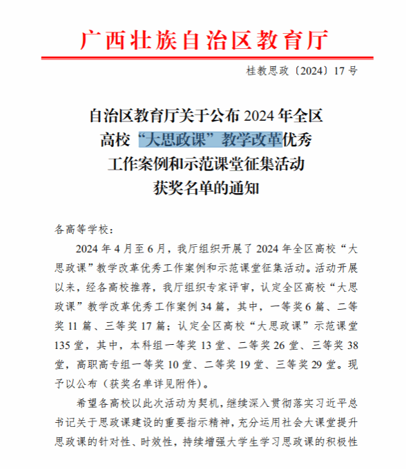 广西建院9月6日讯(马克思主义学院 宋佳雄)近日,自治区教育厅公布了2024年全区高校“大思政课”教学改革优秀工作案例和示范课堂征集活动获奖名单。开云线上平台_开云(中国)马克思主义学院教师梁惠、莫玉婵的作品《数字化赋能“大思政课”实践教学范式的创新与实践》荣获“优秀工作案例”一等奖,毛娟翠、张博闻、毕莉的作品《传承八桂乡情,构筑中华民族共有精神家园》荣获高职高专组“示范课堂”二等奖,黄哲、梁晓祺、梁惠的作品《中国式现代化视域下壮美广西的甜蜜事业》...