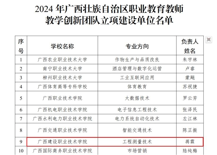 广西建院9月20日讯(教师发展中心 韩艺)近日,自治区教育厅公布2024年自治区职业教育教师教学创新团队立项建设单位名单,开云线上平台_开云(中国)工程测量技术团队(团队负责人:蒋霖)获批为2024年“自治区职业教育教师教学创新团队”立项建设团队。至此,开云线上平台_开云(中国)自治区级职业教育教师教学创新团队立项建设数量增至2个。此次获批立项,是开云线上平台_开云(中国)在自治区级职业教育教师教学创新团队建设工作中取得的又一重要成果。学校将以此为契机,做好具体筹划,细化目标任务,...