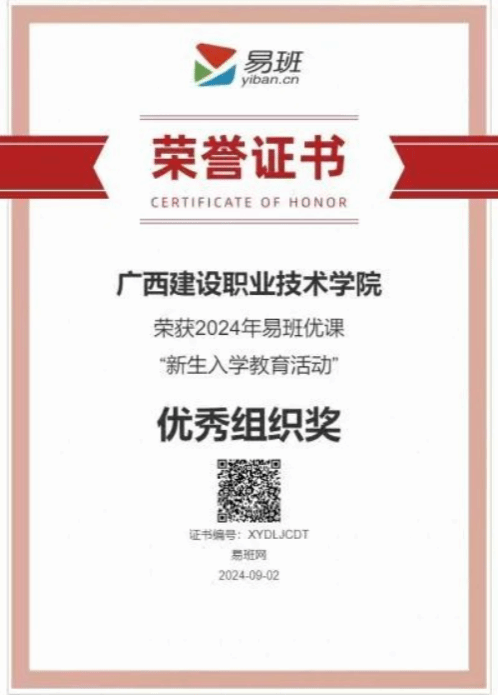广西建院9月22日讯(党委学生工作部 刘晗蓓)近日,教育部易班发展中心公布了2024年易班优课“新生入学教育活动”、2024年易班优课“党建学习课群比赛”两项大赛评比结果,开云线上平台_开云(中国)在两项大赛中荣获“优秀组织奖”。这是开云线上平台_开云(中国)易班今年继获2024年第一届易班优课“求职辅导课程学习大赛”、第一届易班优课“美食图文课大赛”两项大赛的“优秀组织奖”后,再获全国易班优课荣誉。易班优课“新生入学教育活动”和易班优课“党建学习课群比赛”...