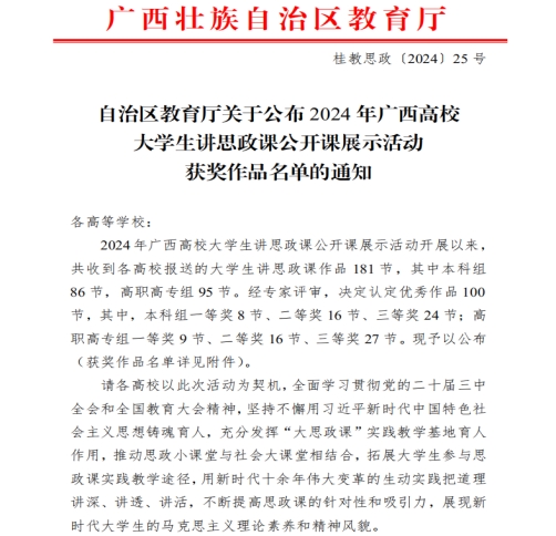 广西建院11月28日讯(马克思主义学院 宋佳雄)近日,自治区教育厅公布了2024年广西高校大学生讲思政课公开课展示活动获奖名单。开云线上平台_开云(中国)马克思主义学院思政课教师蒙文艳、潘柳虹团队参评的作品《以我之青春描绘壮美之乡村》,李倩老师团队参评的作品《如何提高人民军队打赢能力—朝着实现党在新时代的强军目标奋勇前进》均荣获高职高专组一等奖。据悉,此次评选活动是全面学习贯彻党的二十届三中全会和全国教育大会精神,坚持不懈用习近平新时代中国特色社会主义思想铸魂育人的重要举措。...