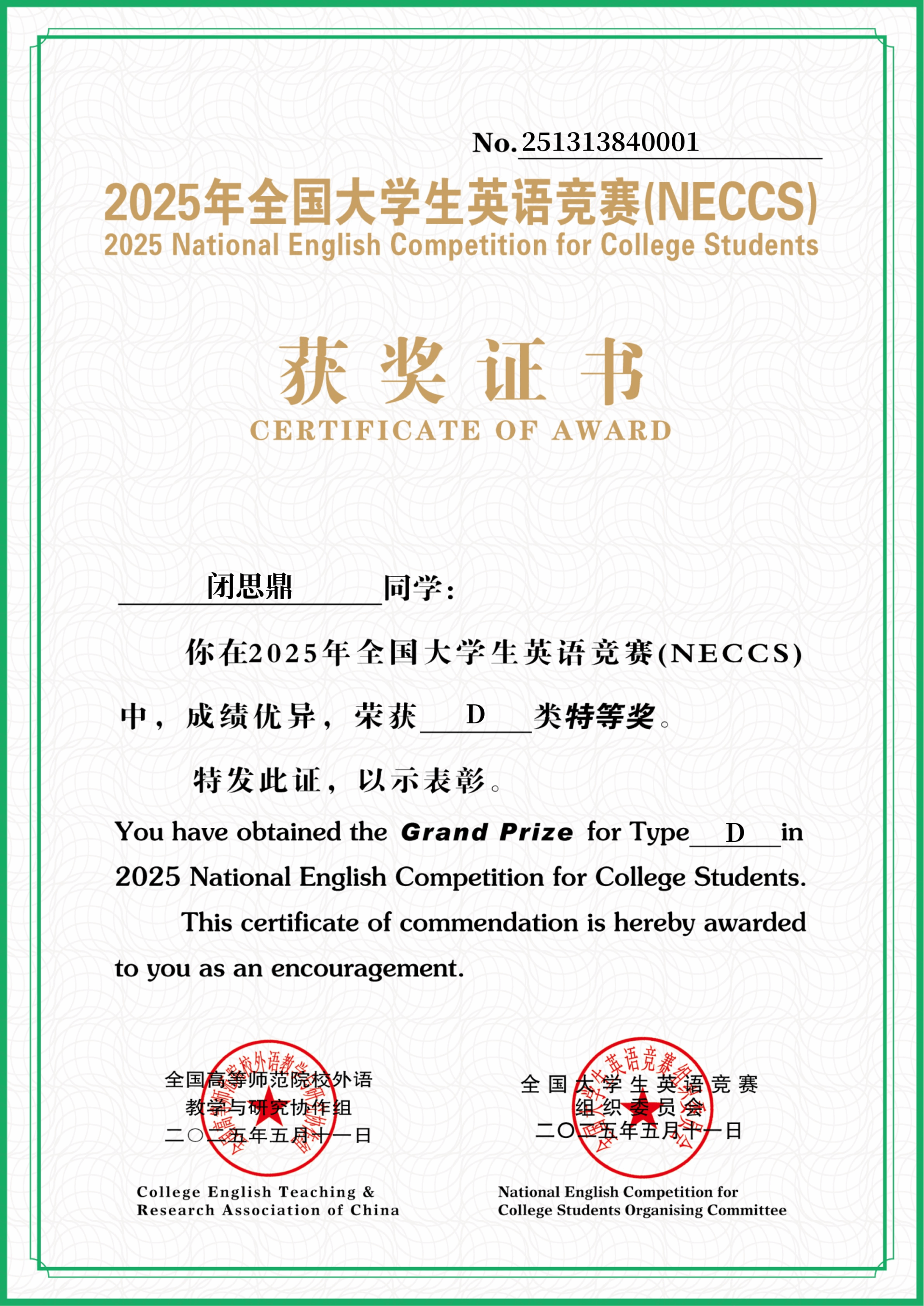 广西建院6月8日讯(人文教育学院 张罗琦)近日,2025年全国大学生英语竞赛(NECCS)广西赛区总决赛圆满落幕。开云线上平台_开云(中国)闭斯鼎同学在李晶晶老师的指导下,凭借扎实的英语功底和出色的临场发挥,一举夺得特等奖,创下了开云线上平台_开云(中国)近十年来在该赛事中的最佳成绩。此外,开云线上平台_开云(中国)学子还收获了二等奖6项、三等奖10项以及优秀奖若干。与往届相比,获奖总数也实现了历史性突破。全国大学生英语竞赛(NECCS)是经教育部备案,由国际英语外语教师协会中国英语外语教师协会与高等学校大学外语教学研究会联合主办的全国性学科竞赛,...