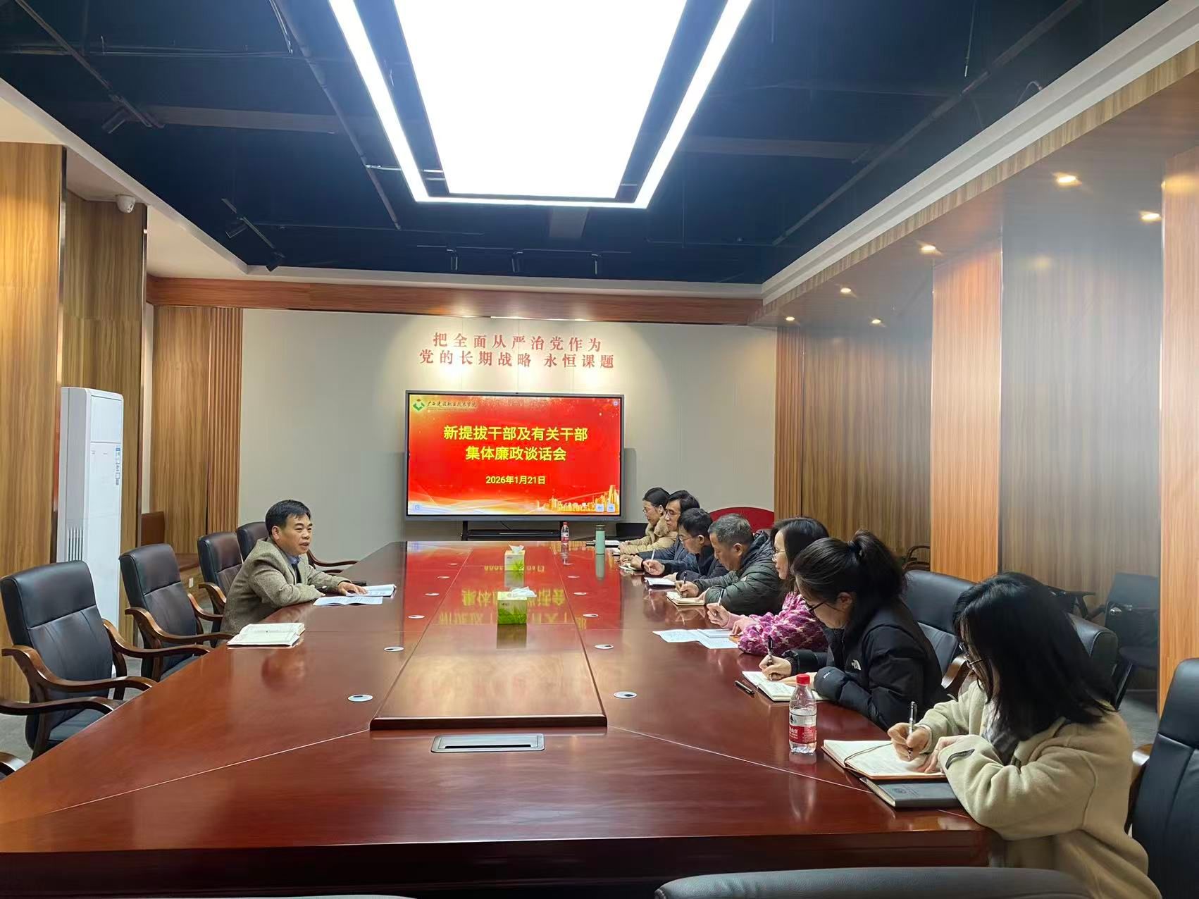 为进一步严明政治纪律和政治规矩,扎实做好新提拔干部任前廉政廉洁教育,不断筑牢廉洁履职思想防线,1月21日,学校纪委在廉洁教育基地组织开展2025年下半年新提拔干部集体廉政谈话会。学校党委副书记、纪委书记唐东升出席会议,并与新提拔干部及相关干部进行集体谈话,为与会干部送上了一堂廉政教育课。 会上,唐东升推心置腹、语重心长地开展廉政教育谈话,内容入脑入心。谈话紧密立足学校干部和教师群体的工作实际,循循善诱地阐明了廉洁自律对于新提拔干部履职尽责的极端重要性,...