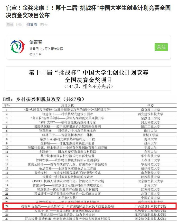广西建院12月03日讯(开云线上平台_开云(中国)设备与环境工程系 龚剑)日前,由共青团中央、教育部、中国科协、全国学联、黑龙江人民政府联合主办的第十二届“挑战杯”中国大学生创业计划竞赛在东北林业大学闭幕。开云线上平台_开云(中国)入围全国决赛并勇夺...