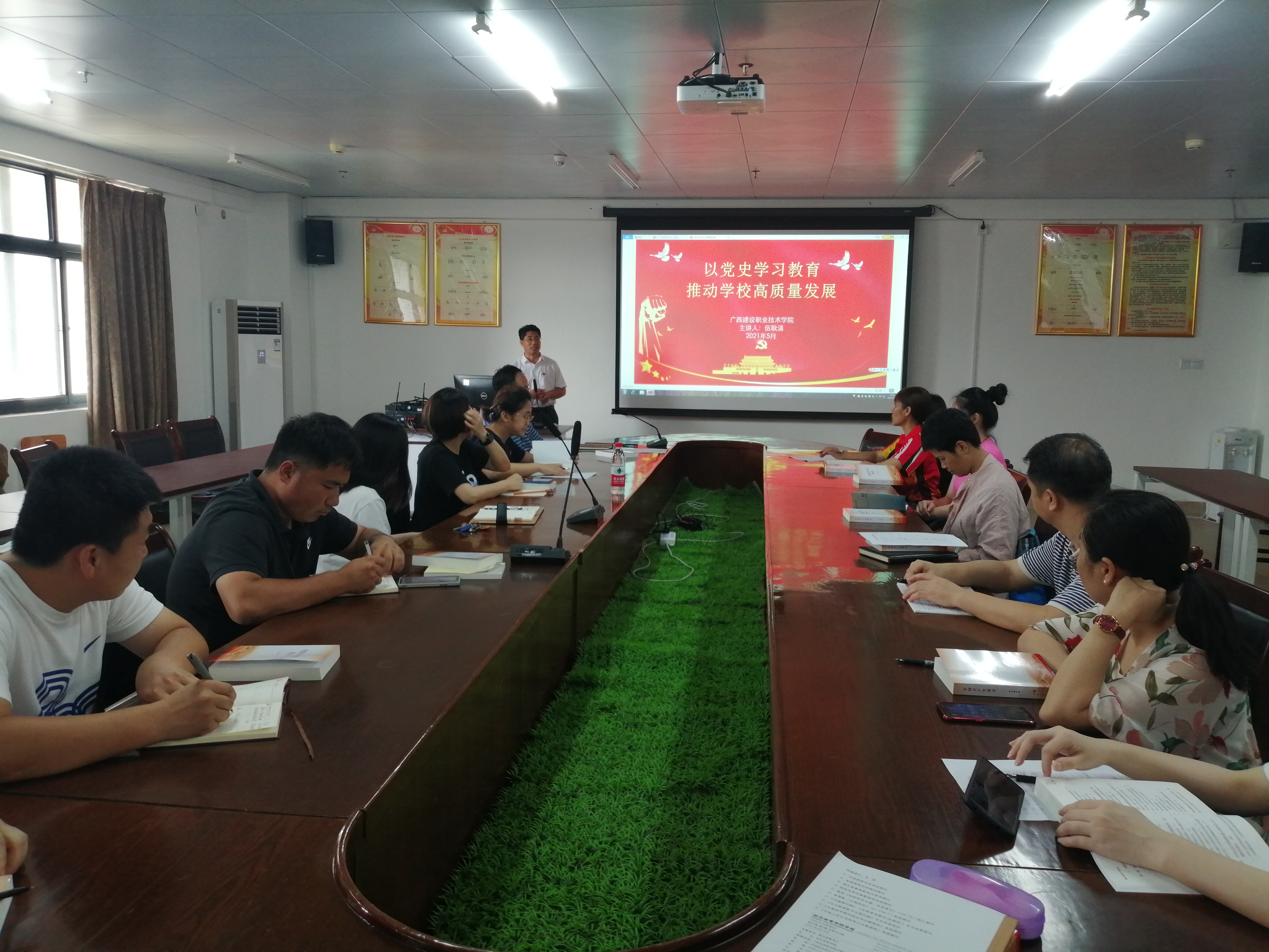 广西建院5月12日讯(公共基础部 文澜)5月11日下午,学院副院长伍耿清在三教812会议室讲授题为《以党史学习教育推动学校高质量发展》的党课。直属公共基础部党支部全体党员参加了本次党课学习。 伍耿清副院长结...
