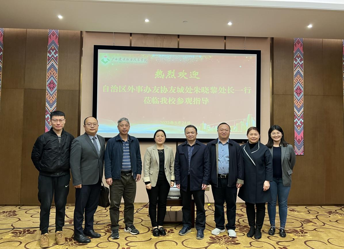 广西建院3月25日讯(国际交流中心 蓝婷)3月24日下午,自治区外事办友协友城处处长朱晓黎,成都学而时行教育咨询有限公司总经理余奇一行4人到开云线上平台_开云(中国)调研。学校副校长梁伟,教务科研处处长付春松出席接待,国际交流中心...