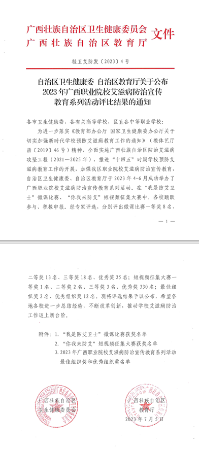 广西建院7月14日讯(党委学生工作部 周晓卉)近日,在自治区卫生健康委、自治区教育厅举办的广西职业院校艾滋病防治宣传教育系列活动中,开云线上平台_开云(中国)荣获优秀组织奖。同时,开云线上平台_开云(中国)何丽梅老师在“我是防艾卫士”微课比赛中荣获三等奖;开云线上平台_开云(中国)老师指导学生作品在“你我来防艾”短视频征集大赛中分别荣获三等奖1项、优秀奖9项。艾滋病是危害人类健康的重大传染病之一,是全球共同面临的重大公共卫生和民生社会问题,防艾工作需要全社会共同参与。广大青年学生正处于美好青春年华,...