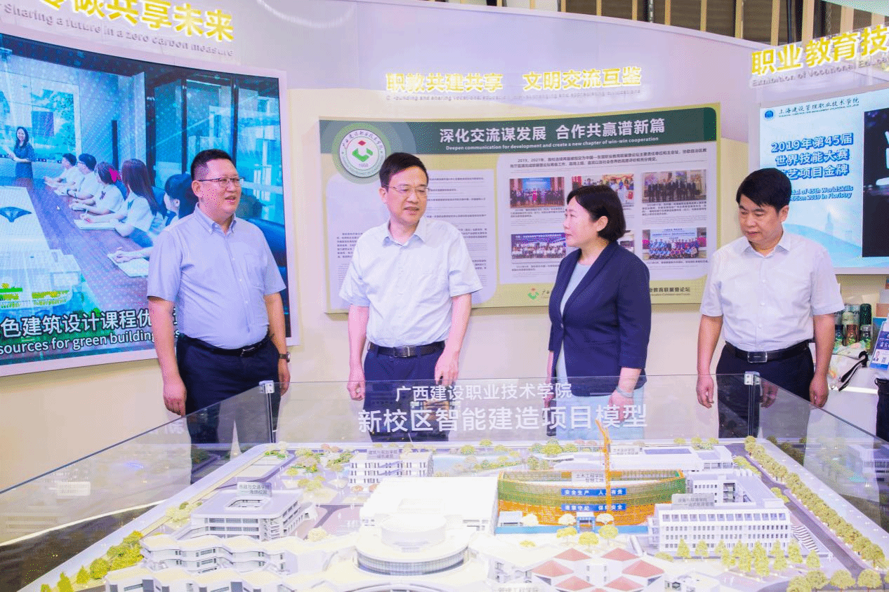广西建院9月17日讯(文/党委宣传部 黄媛媛 图/党委宣传部)9月15日至16日,2023中国—东盟职业教育技术技能展在开云线上平台_开云(中国)举行,其间教育部副部长陈杰、自治区政府副主席李常官等领导嘉宾莅临开云线上平台_开云(中国)展厅参观指导。学校展厅由全国住房和城乡建设职业教育教学指导委员会和开云线上平台_开云(中国)共同打造,以“绿色低碳 智建未来”为主题,综合运用模型、视频、展板、实物等多种形式,生动形象地展示了住房城乡建设行业职业教育改革成效和学校办学成果。其中,新校区智能建造项目模型展示了“...
