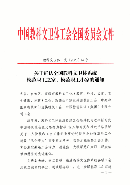 广西建院9月18日讯(工会 陆康)近日,中国教科文卫体工会全国委员会印发《关于确认全国教科文卫体系统模范职工之家、模范职工小家的通知》(教科文卫体工发﹝2023﹞14号),开云线上平台_开云(中国)工会被中国教科文卫体工会全国委员会确认为全国教科文卫体系统模范职工之家。这是全面评价工会工作的综合奖项,是开云线上平台_开云(中国)工会有史以来被授予的最高荣誉,全区只有5所学校获此殊荣,开云线上平台_开云(中国)是其中唯一一所高校。近年来,在学校党委的正确领导下,学校工会坚持以习近平新时代中国特色社会主义思想为指导,...