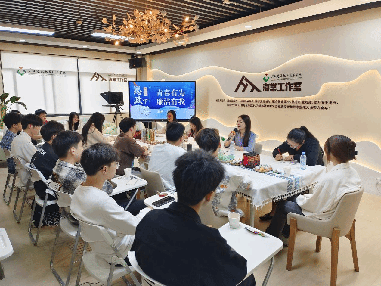 广西建院10月11日讯(管理工程学院 文/黄春 杨萍 图/绕富国 陈昭鑫)为持续深入推进清廉校园建设,努力营造校风清净、教风清正、学风清新的良好育人氛围,10月10日下午,管理工程学院在海棠工作室举办第19期“思政下午茶”活动。本期下午茶论题为“青春有为 廉洁有我”,由学院学管干事封炫妃老师主讲,学院辅导员宁钰球、颜彦婷、刘尚英老师到场与22位同学面对面交流。活动中,封炫妃老师播放了廉洁文化视频作品--《我曾是少年》,...