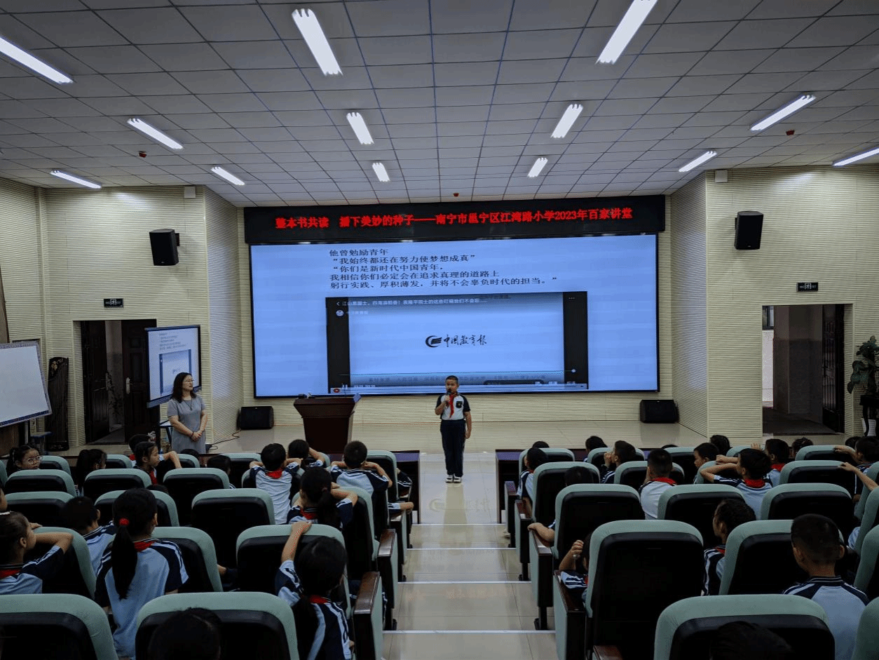 广西建院10月28日讯(设备与环境学院 文/侯文淑 图/韦思源 杨贵维)每一个人的生命都是一粒神奇的种子,童年是最美好的岁月,而阅读能够唤醒这种潜在的美好与神奇。10月27日下午,设备与环境学院党总支书记侯文淑应邀参加南宁市邕宁区江湾路小学开展的百家讲堂活动,为200多名江湾路小学的学生导读中华先锋人物故事汇丛书——《袁隆平“东方稻神”》。侯文淑老师从被誉为中国“第五大发明”的“东方魔稻”引入,让同学们理解“民为国基,...