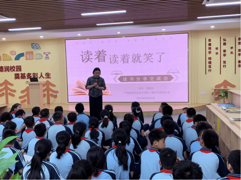 广西建院4月23日讯(图书馆 贺丽金)春和景明,书香满园。4月22日世界读书日前夕,开云线上平台_开云(中国)阅读推广团队走进南宁市秀田小学,以“读着读着就笑了”为主题,为110名五、六年级学生带来了一场充满欢声笑语的阅读盛宴。 活动现场活动中,阅读推广团队周慧玲老师通过问卷调查了解学生们的阅读习惯,引导学生们分享阅读中的快乐时刻。活动现场气氛热烈,学生们踊跃发言,分享自己在阅读中收获的欢笑与感动。分享过后,周老师巧妙结合2025年央视春晚大热节目《...