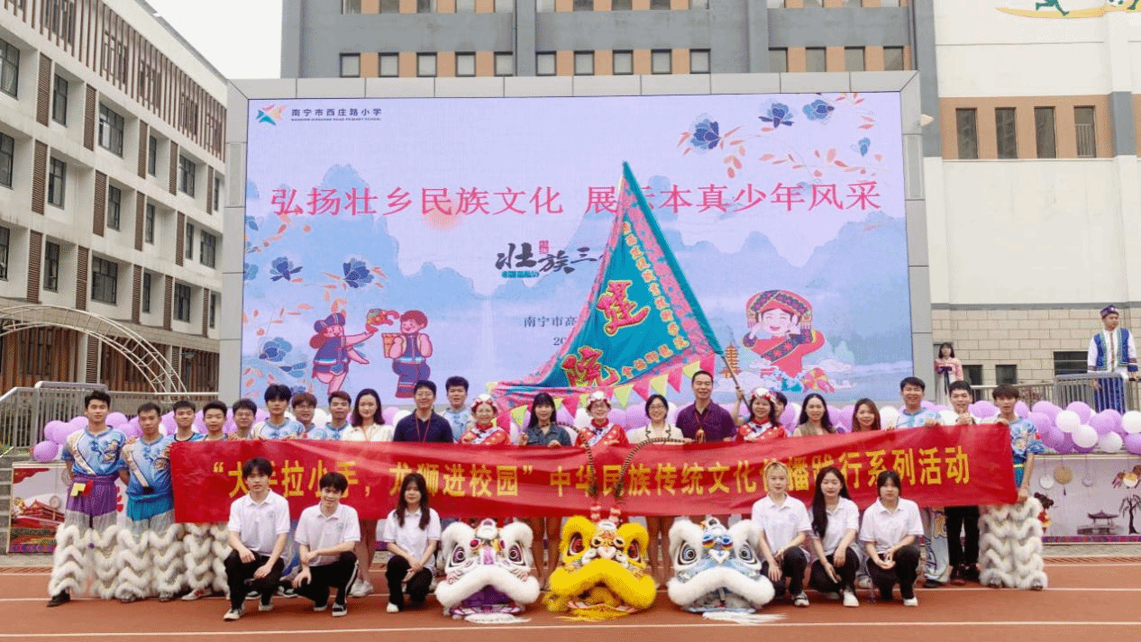 广西建院4月21日讯(信息工程学院 文/曹婷婷 图/李雨虹 黄诗雨)为了丰富校园文化生活,培养学生的民族自豪感,4月20日上午,信息工程学院团总支与西庄路小学联合开展“大手拉小手,龙狮进校园”中华民族传...