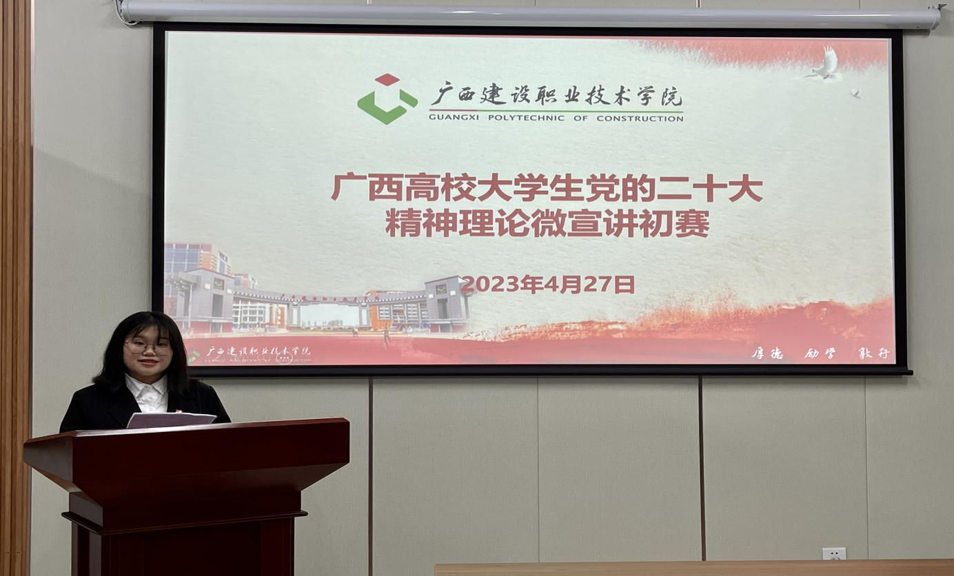广西建院4月28日讯(党委学生工作部 文/周晓卉 图/莫芸瑕)为认真贯彻落实《自治区党委教育工委办公室 自治区教育厅办公室关于开展广西高校大学生党的二十大精神理论微宣讲比赛的通知》(桂教工委办〔2023〕59 ...