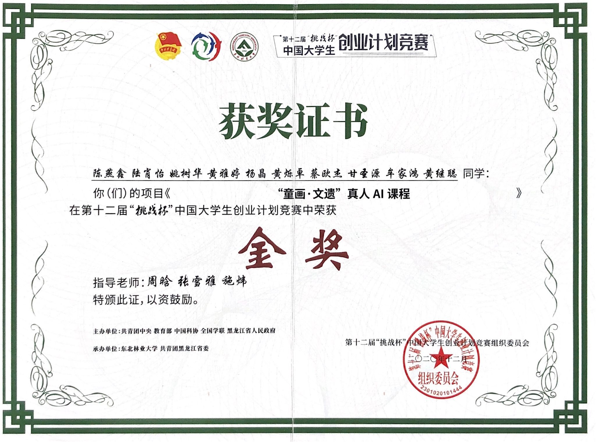 第十二届“挑战杯” 中国大学生创业计划竞赛全国金奖